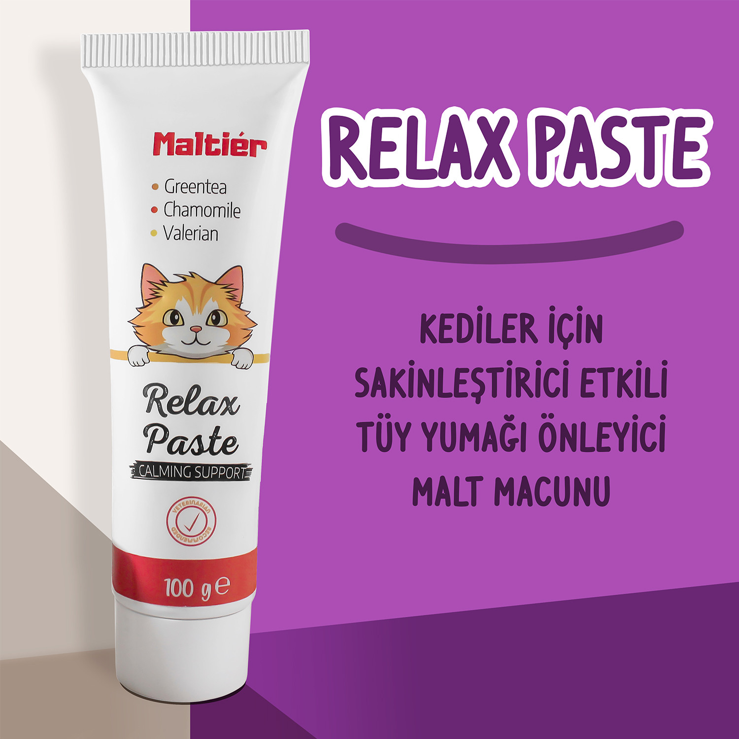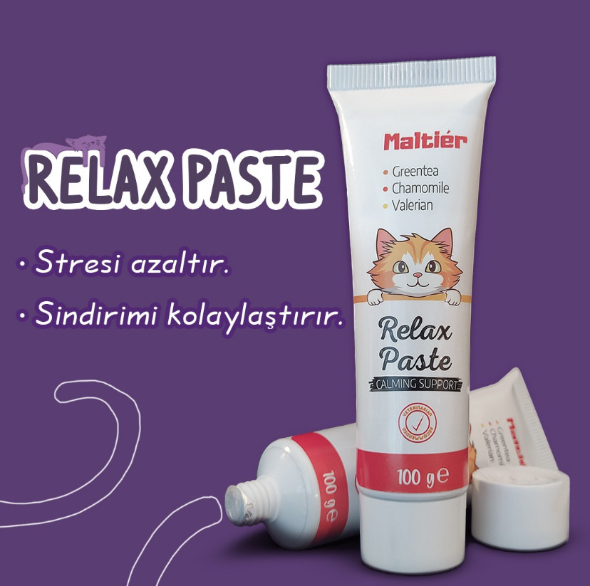 RELAX PASTE KEDİLER İÇİN RAHATLIK VE SAKİNLİĞİ DESTEKLEYEN MALT MACUNU Malt Paste for Cats that Supports Relaxation and Well-Being Kedilerin; ortam değişikliği, gök gürültüsü ve yüksek sesli ortamlarda, çiftleşme ziyaretlerinde, yeni bir yuva, yeni insanlar ve yeni bir pet hayvanı ile tanışma süreci gibi stresli durumlarında sakinliği ve rahatlığı destekleyerek stresi ortadan kaldırmaya ve rahatlamaya yardımcı olur. Böylelikle kedilerin sağlığını destekler. Ayrıca lifli yapısı ve içerdiği prebiyotikler ile kedilerin bağırsak ve sindirim sisteminde biriken tüy yumaklarının atılımına yardımcı olur. It helps to reduce stress by promoting calm and relaxation in a variety of stressful situations such as change of environment, loud noises, mating visits, new home, new people, meeting a new pet and travel. It supports the mental health of cats and dogs. It supports the fibre requirement for the elimination of indigestible components from the body. Helps hairballs pass smoothly and gently through the intestines